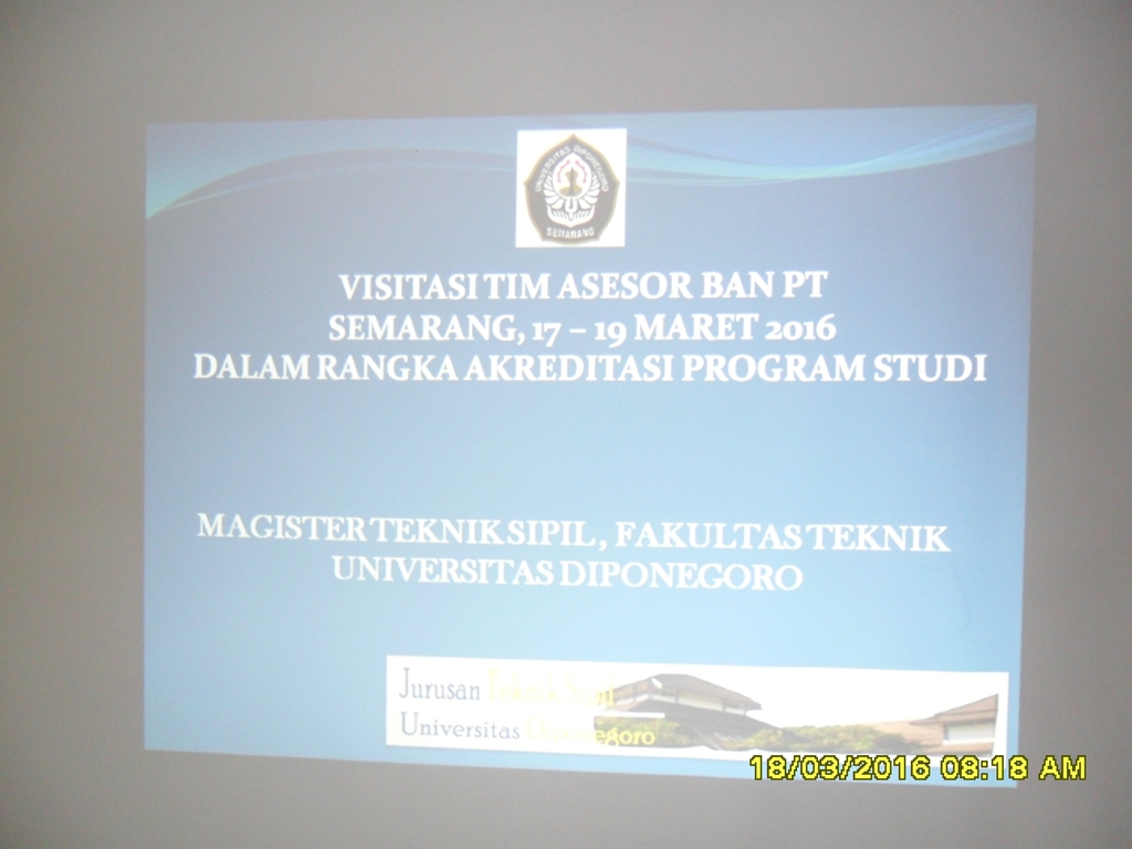 Proses Visitasi ke Program Studi Magister Teknik Sipil dilaksanakan pada hari Jumat, 18 Maret 2016. dimulai dengan pembukaan yang dibuka langsung oleh Bapak Dekan Fakultas Teknik Ir. M. Agung Wibowo, MM, M.Sc, Ph.D yang kemudian diisi oleh sambutan Bapak Rektor UNDIP Prof. Yos Johan Utama, yang mana UNDIP memang bertekad untuk mendorong Program Studi yang masih terakreditasi B untuk bisa menjadi A sehingga Bapak Rektor sendiri hadir dan memberikan sambutan.